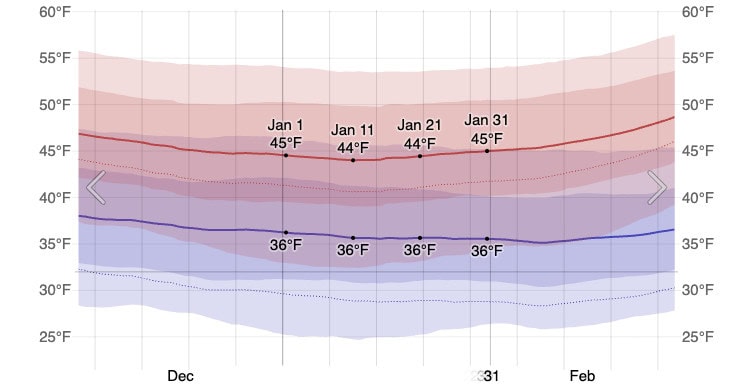 This graph, produced by WeatherSpark, shows the average highs and lows for January: